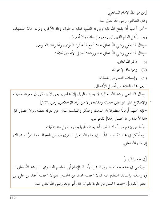 Al-Shafi`i said, may Allah have mercy on him: “Only the sincere one (mukhlis) knows hypocrisy (riya’).” This means that it is impossible to know the reality of hypocrisy and see its hidden shades except for one who resolutely seeks (arada) sincerity. That one strives for a long time searching and meditating and examining at length within himself until he knows or knows something of what hypocrisy is.
